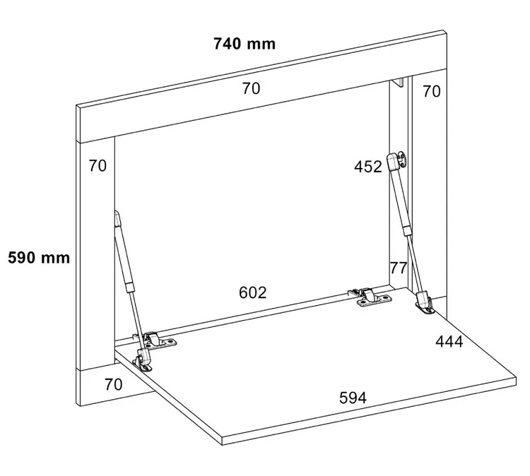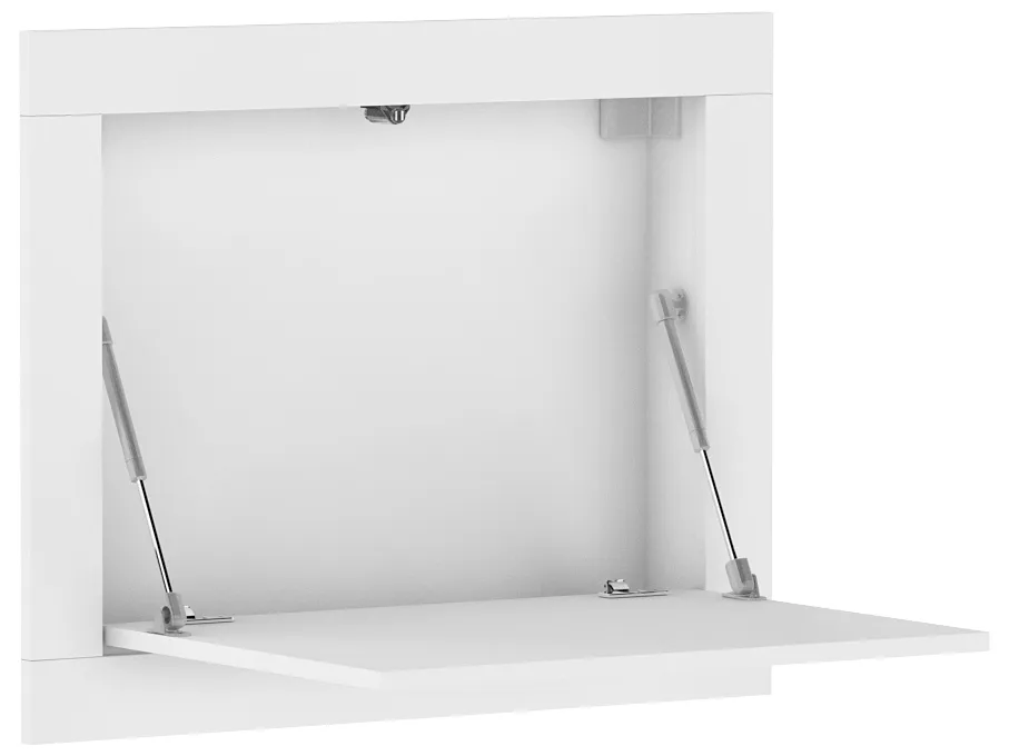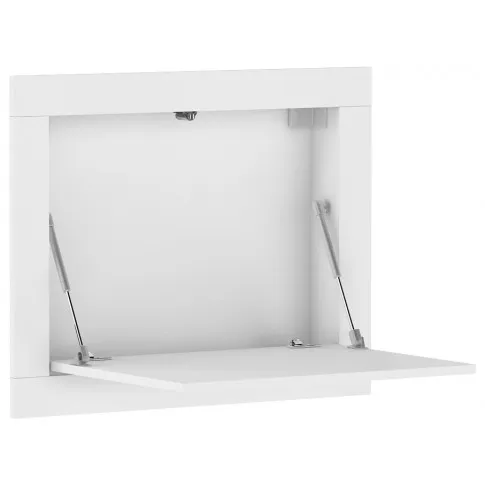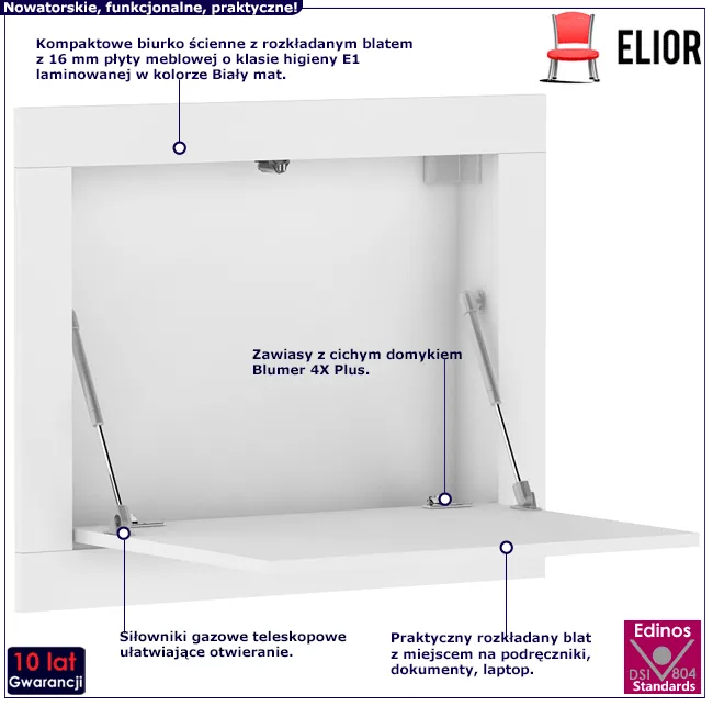 Kompaktowe biurko ścienne Telim zrobiliśmy z najwyższej jakości 16 mm laminowanej płyty meblowej o klasie higieny E1. Płyta meblowa została zbudowana z włókien drzewnych i związków organicznych w warunkach wysokiego ciśnienia i temperatury. Włókna ułożone są różnokierunkowo, co podnosi parametry wytrzymałościowe i jakościowe surowca. Obrzeża zostały precyzyjnie oklejone specjalistycznym tworzywem PCV o zwiększonej odporności na ścieranie. Rozkładany blat został wyposażony w system Push to open i zawiasy z opcją cichego domyku Blumer 4X Plus. Dzięki temu otwiera się po lekkim naciśnięciu frontu i zamyka bez hałasu. Praktyczne teleskopowe podnośniki gazowe ułatwiają składanie blatu po zakończonej pracy.