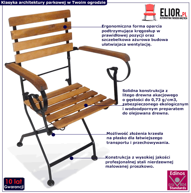 Stylowe krzesła Etna 2X marki Edinos Premium to wyjątkowy projekt z cyklu małej architektury ogrodowo-parkowej inspirowany najsłynniejszymi ogrodami świata. Zaprojektowane w stylu parkowym stanowią praktyczny, trwały i elegancki zestaw wypoczynkowy, który fantastycznie podkreśli niezwykły charakter Twojego ogrodu. Ich wygoda i funkcjonalność w połączeniu z ciepłem naturalnego drewna akacjowego i finezyjnymi liniami stalowej konstrukcji doskonale sprawdzą się podczas letnich ogrodowych przyjęć. Uprzyjemnią wieczory spędzone na tarasie lub na patio i popołudnie spędzone w uroczej kawiarence. Z zestawem ogrodowym Etna 2X Twój ogród rozkwitnie! Zamów krzesła ogrodowe Etna 2X w promocyjnej cenie i sprawdź do czego zainspiruje Cię Twój piękny ogród już teraz!