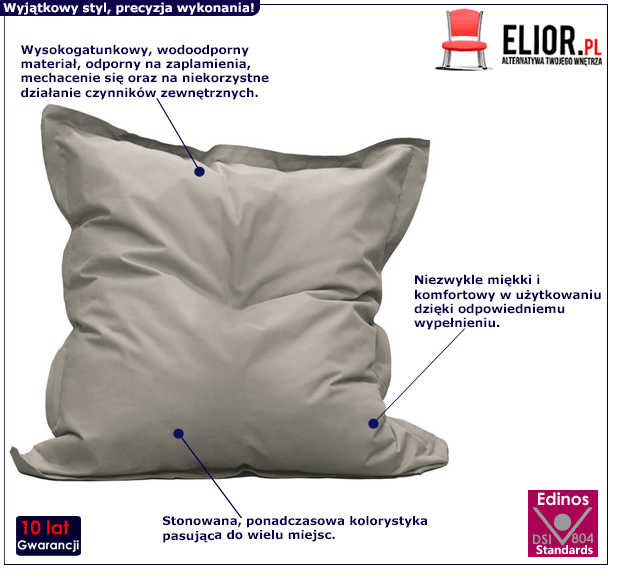 - Produkt posiada certyfikat jakości "Edinos Standards DSI 804", który potwierdza najwyższą jakość wykonania mebla oraz pełny stopień zgodności poszczególnych jednostek wytworzonego wyrobu z przyjętym wzorcem.