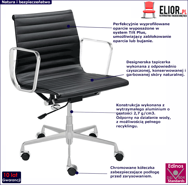 Na pewno troszczysz się o bliskie Ci osoby. Dlatego też stawiasz na to co w pełni naturalne i bez alergenów. Jeżeli chcesz ograniczyć ilość sztucznych materiałów i chemii w swoim otoczeniu zdecyduj się na ekologiczny zakup produktu firmy Elior. Fotel jest pokryty naturalną skórą, która fenomenalnie prezentuje się w komercyjnych wnętrzach, a także przy domowym biurku. Obicie fotela zostało wykonane z najwyższej jakości skóry naturalnej, która jest sztywniejsza i grubsza od skóry ekologicznej, co sprawia, że materiał ten jest bardziej wytrzymały na jakiekolwiek uszkodzenia. Jej charakterystyczny wygląd, faktura oraz zapach są efektem procesów przygotowujących skórę do wykorzystania w charakterze materiału. Skóra naturalna jest wynikiem czyszczenia, garbowania, licowania oraz konserwacji. Producenci marki Elior stawiając na wyspecjalizowaną technologię używając produktów przeznaczonych do garbowania skóry, w tym Rotaninę M70, która stanowi skuteczny zamiennik syntetycznych preparatów o właściwościach wybielających. Obszycie oparcia i siedziska naturalną skórą pochodzenia zwierzęcego to trwałość potwierdzona wieloletnią gwarancją. Korpus fotela to wysokiej jakości ekologiczny, lekki metal o gęstości do 2,7 g/cm3. Aluminium w pełni poddaje się recyklingowi, jest odporny na działanie wody, wielu kwasów organicznych i związków azotowych. Nie ulega matowieniu, dzięki czemu długo zachowuje estetyczny wygląd. Ekologia i natura nie zawsze musi kojarzyć się z ubogą wersją wizualną. Fotel biurowy Lincoln 3X to połączenie tego co organiczne z dodatkiem oryginalności.