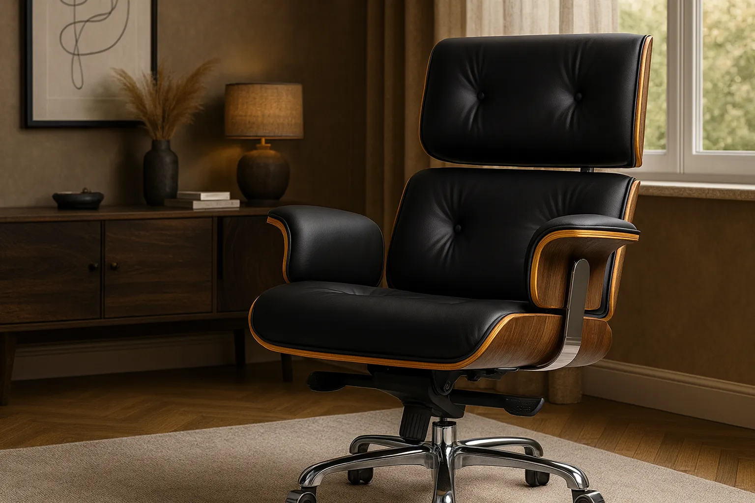 - Modny kolor: czarna tapicerka i obicie z naturalnego drewna orzechowego. Sprawdź także inne obrotowe fotele biurowe ze skóry naturalnej i ekologicznej