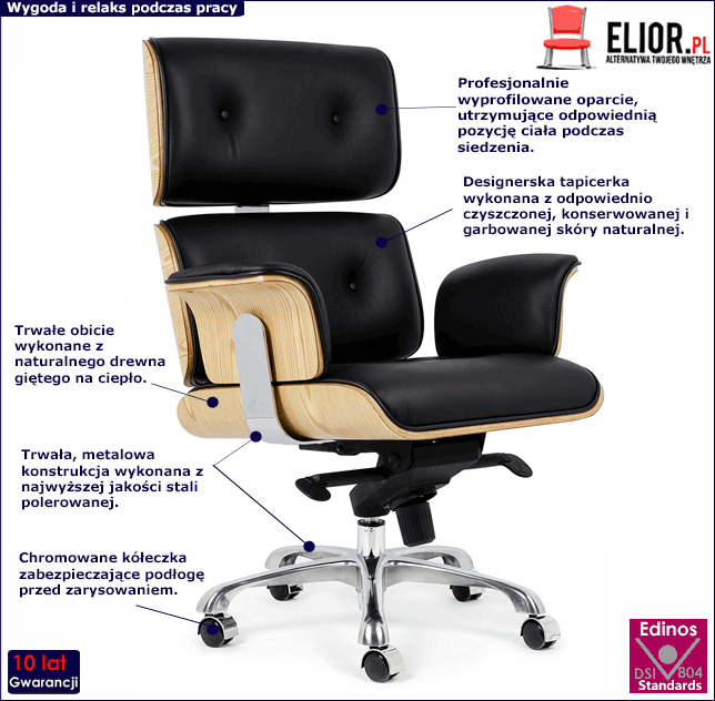 - Modny kolor: czarna tapicerka i obicie z naturalnego drewna jesionowego. Sprawdź także inne obrotowe fotele biurowe ze skóry naturalnej i ekologicznej