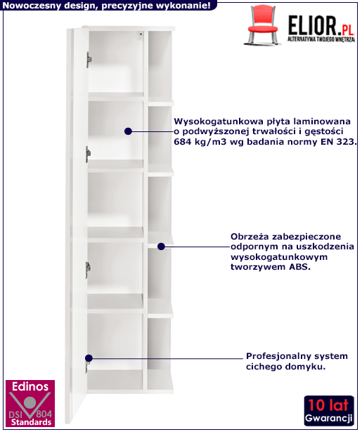 Niezastąpieni specjaliści marki Elior projektując kolekcję Malaga Biały zadbali o to, by meble te zapewniły Ci długoletnie zadowolenie. Starannie wyselekcjonowane produkty meblarskie wykorzystane do jej stworzenia sprawiają, że meble są solidne i niezwykle trwałe. Materiał z jakiego wykonane są meble z kolekcji Malaga Biały to najwyższej jakości płyta laminowana o podwyższonej trwałości i gęstości zbudowana z włókien drzewnych i związków organicznych w warunkach wysokiego ciśnienia i temperatury. Włókna ułożone są różnokierunkowo, o strukturze sinusoidalnej, co zapewnia nadanie jej cech jakościowych oraz wytrzymałościowych. Dodatkowo płyta została uszlachetniona cienkimi filmami melaminowymi w celu zwiększenia jej trwałości. Brzegi mebli oklejono specjalistycznym materiałem ABS, cechującym się ponadprzeciętną odpornością na zarysowania. Ponadto ten zabieg sprawił, że meble prezentuje się wyjątkowo estetycznie. Nasze meble wykonane są dokładnie tak, jak chcielibyśmy mieć we własnych domach. Właśnie dlatego masz pewność, że przez długi czas zapomnisz o ich wymianie! Postaw na ponadczasowy design i niedoścignioną jakość jaką oferuje Ci marka Elior - postaw na Malaga Biały!