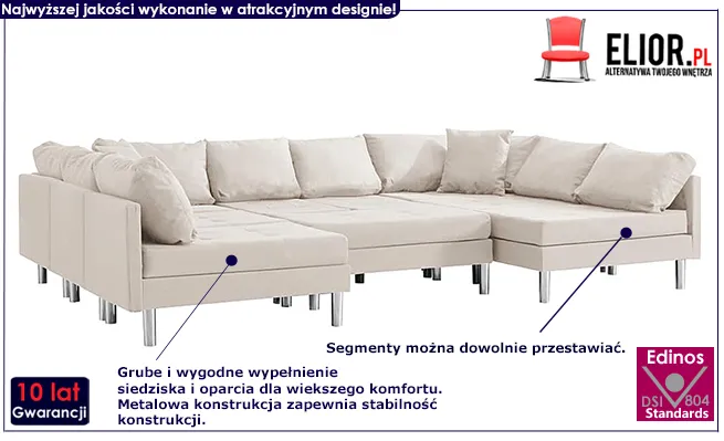 Dlatego ważnym elementem w ich produkcji jest użycie jak najlepszych materiałów, tak aby mebel nie tracił na swojej funkcjonalności i urodzie  w trakcie eksploatacji. Tak powstała nasza sofa modułowa Astoa. To dopracowany w każdym elemencie model, który zachowa świeżość i komfort pracy przez wyjątkowo długi czas. Stąd nasza gwarancja na aż 10 lat! Elementy sofy można w dowolny sposób przestawiać, dzięki czemu można w łatwy sposób uzyskać sofę narożną, zestaw foteli czy łóżko. Niewielka waga modułów dodatkowo ułatwia ich układanie. Astoa została zaprojektowana w nowoczesnym stylu, który łatwo wkomponować w dowolny wystrój wnętrza. Dzięki temu to nie tylko wygodny mebel, ale również  doskonały element dekoracyjny. Z naszą sofą z łatwością zaimponujesz znajomym Twoim dobrym gustem i dbałością o każdy detal.