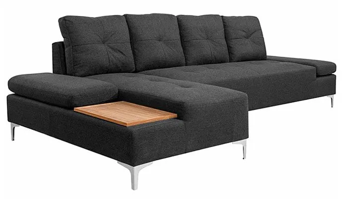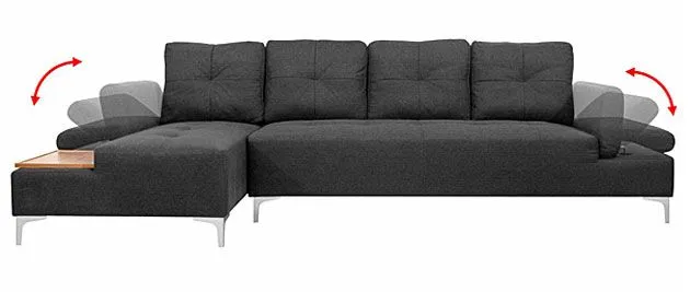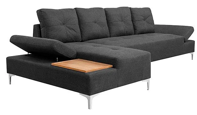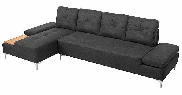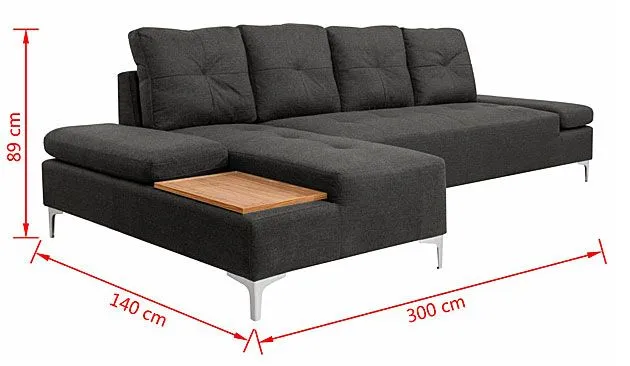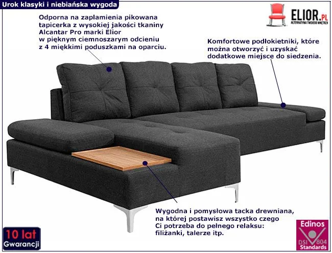 Sofa narożna Kazja 3T marki Elior to jedna z 4 opcji kolorystycznych tego modelu: cappuccino, grafit, brązowy i niebieski. Szlachetny odcień grafitu to bardzo modny wybór, który nie bez powodu ma tylu fanów. Jest to kolor łączący pewną neutralność i jednocześnie charakter, który decyduje o wydźwięku estetycznym całej aranżacji wnętrza. Corintia jest dużym meblem, który zapewni miejsce do wypoczynku dla kilku osób. Ma długość aż 300 cm, szerokość 140 cm (część narożna) i wysokość 89 cm. Wyposażona jest w wyjątkowo miękkie, superwygodne siedzisko, cztery rozkoszne poduszki na oparciu, zapewniające ulgę dla zmęczonych pleców oraz dwa podłokietniki. Te ostatnie można podnieść, co widać na załączonym zdjęciu i uzyskujemy w ten sposób dodatkowe miejsca do siedzenia. Oprócz tego, Kazja 3T ma w zestawie pomysłową  drewnianą deskę o ładnym, nasyconym odcieniu, na której można postawić filiżanki, szklanki czy talerzyki z jedzeniem. Na tej sofie spędzisz najfajniejsze wieczory i popołudnia, np. z filmem i przekąską.
