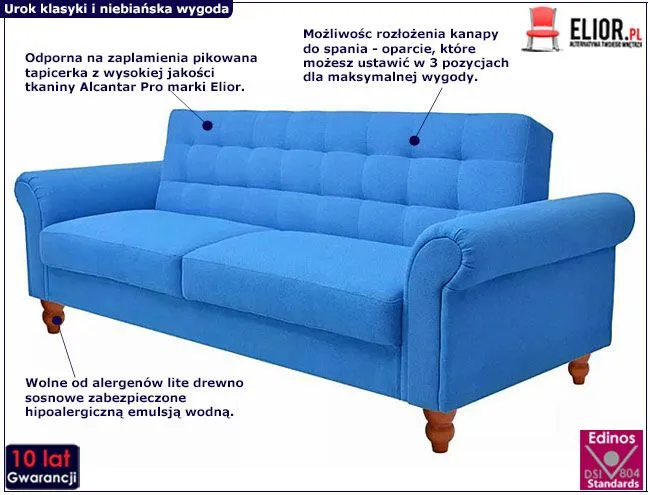 • Elegancja klasycznego kształtu, przyjemna dla zmysłów miękkość i zachwycający nasycony błękit, tak bardzo inny od nudnych, zgaszonych mebli  zobacz też inne sofy w sklepie Edinos.pl - na pewno znajdziesz coś dla siebie!