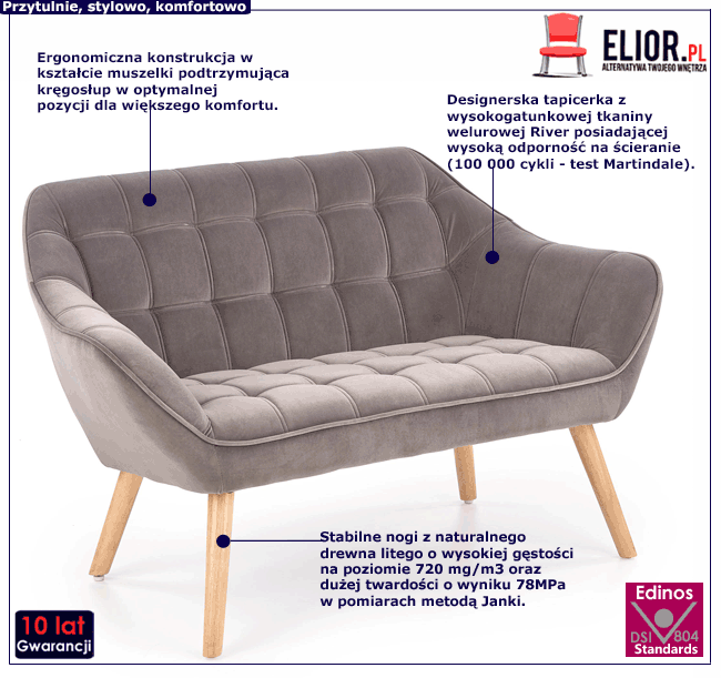 Tapicerowana sofa klubowy Avery 3X to mebel zaprojektowany i wykonany z materiałów najwyższej jakości. Designerska tapicerka to wysokogatunkowa tkanina obiciowa River typu velvet. Materiał ten jest niesamowicie miękki i aksamitny w dotyku, a szlachetny odcień perłowej szarości dodaje całości subtelnej lekkości i wyrafinowanego wdzięku. River to jeden z francuskich welurów posiadający bardzo dobrą odporność na ścieranie (do 100 000 cykli – test Martindale). Zapomnij o stresie z powodu rozlanej kawy czy herbaty – teraz będziesz cieszyć się urodą swojego fotela Avery 3X przez wiele lat bez konieczności wymiany tapicerki. Doskonale wyważone i stabilne nóżki fotela stworzone zostały z naturalnego drewna litego charakteryzującego się wysoką gęstością na poziomie do 720 mg/m3 oraz wyjątkowo dużą twardością o wyniku do 98 MPa w pomiarach metodą Janki. Nóżki zostały wybarwione hipoalergiczną bezbarwną wodną emulsją, co znacznie podnosi estetykę mebla i pozytywnie wpływa na jego trwałość. Odpoczywaj w przyjaznych ramionach kanapy Avery 3X marki Elior.