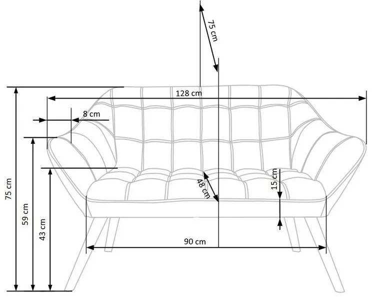 • Wymiary: szerokość: 128 cm, głębokość: 75 cm, wysokość: 75 cm, wysokość siedziska: 47 cm.