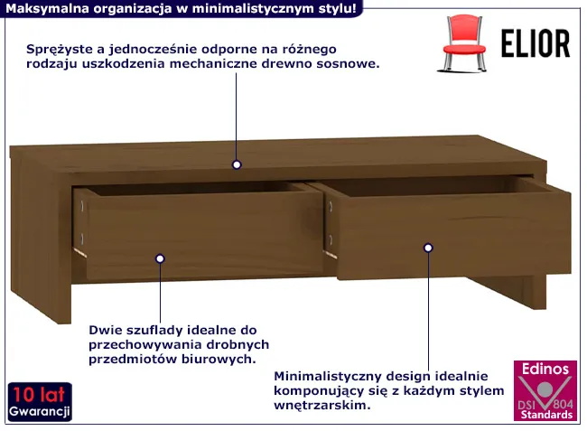 • Kolor: miodowy brązKliknij w link i sprawdź także inne nadstawki, półki na biurko w sklepie Edinos.pl. Stwórz swóją praktyczną przestrzeń.