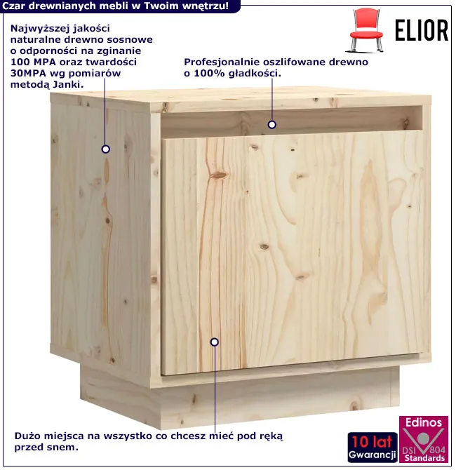 Odkryj szafkę nocną Nivela od Edinos Premium - mebel, który łączy nowoczesny design z ciepłem naturalnego drewna. Nivela to nie tylko praktyczny element wyposażenia, ale także subtelny akcent dekoracyjny, który dodaje uroku każdej przestrzeni. Zaprojektowana z myślą o tych, którzy cenią sobie porządek i styl, ta szafka nocna jest idealnym towarzyszem spokojnych wieczorów i leniwych poranków. Wykonana z litego drewna sosnowego, Nivela jest synonimem jakości i trwałości. Jej uniwersalny design sprawia, że doskonale wpisuje się w różnorodne wnętrza, od klasycznych po nowoczesne.