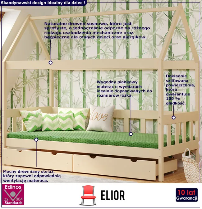 Łóżko wykonano z drewna sosnowego sprężystego, a jednocześnie odpornego na różnego rodzaju uszkodzenia mechaniczne. Ponadto sosna ma dobroczynny wpływ na ludzkie zdrowie. I tu uwaga: sosna wykazuje właściwości higroskopijne – reguluje poziom wilgotności powietrza przez pochłanianie i oddawanie pary wodnej do otoczenia. Dodatkowo sosna ma właściwości elektrostatyczne, a więc nie tylko nie przyciąga kurzu, ale zapobiega również jego kłębieniu się w powietrzu. Łóżka sosnowe są ekologiczne, dlatego szczególnie polecane są alergikom i małym dzieciom. Emulsje ochronne marki Elior produkowane na bazie wody są całkowicie wolne od formaldehydu, dzięki czemu charakteryzują się neutralnym zapachem. Nie zawierają substancji, które w trakcie użytkowania mebli mogą się ulatniać, ani innych szkodliwych związków chemicznych. Do zestawu dołączono komfortowy materac dopasowany do wymiarów łóżka tak, by Twoje dziecko mogło spać w nim jak najszybciej. Wybierz mebel, który sprawi Tobie i dziecku wiele radości.