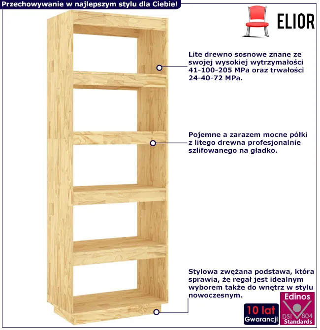 • Ekologiczny wybór: drewno sosnowe jest materiałem odnawialnym, co czyni regał wyborem przyjaznym dla środowiska.