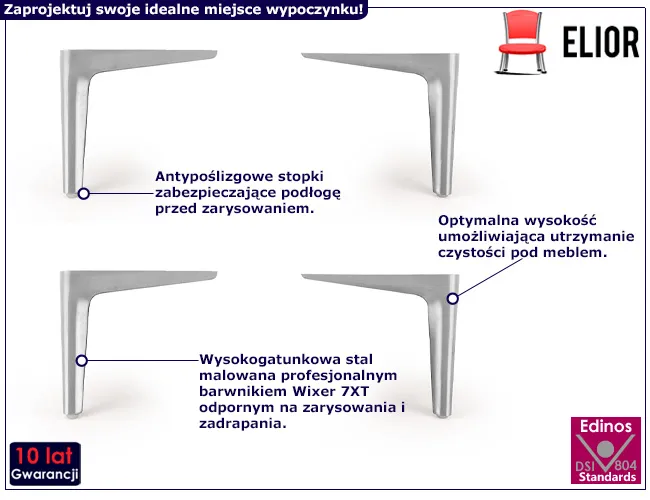 W świecie mebli nie ma nic piękniejszego niż stylowe, eleganckie i funkcjonalne łóżko. Właśnie dlatego marka Edinos Premium zapewnia Ci możliwość stworzenia unikatowego projektu, dzięki któremu z radością przywitasz każdy kolejny dzień. Do skompletowania doskonałego modelu niezbędne są stalowe nóżki unoszące łóżko. Nóżki Irto to trwałe i solidne rozwiązanie, które zapewnia stabilność i równowagę łóżka. Wykonane z wysokogatunkowej stali są odporne na uszkodzenia. Dzięki antypoślizgowym stopkom, które zabezpieczają podłoże, łóżko pozostaje stabilne na swoim miejscu, co zwiększa bezpieczeństwo użytkowania. Nóżki są łatwe w montażu, dzięki czemu w prosty i łatwy sposób przymocujesz je do łóżka.