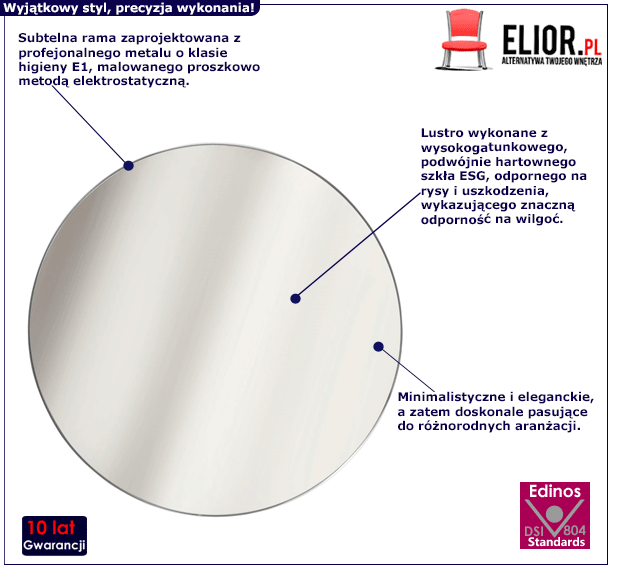 Eleganckie lustro Matis zostało zaprojektowane starannie i szlachetnie – tak, by mogło służyć swoją piękną prezencja i wygodą użytkowania na lata. Główną zasługą doskonałego wykonania lustra jest wybór odpowiednich surowców. Stylowe lustro Matis powstało z wysokogatunkowego, podwójnie hartownego szkła , odpornego na rysy i uszkodzenia. Ponadto szkło wykazujące znaczną odporność na wilgoć oraz odporność na wysoką temperaturę i nawet po długim użytkowaniu nie traci swoich właściwości. Rama lustra została wykonana z profesjonalnego metalu o klasie higieny E1, malowanego proszkowo metodą elektrostatyczną. Wybór tych właśnie surowców sprawia, że lustro Matis prezentuje się efektownie, a zarazem harmonijnie i subtelnie. Ponadto charakteryzuje się trwałością, odpornością na rysy oraz łatwością w czyszczeniu. Przepiękne, proste, a zarazem jakże urocze lustro Matis nie tylko stanowi doskonałą dekorację wnętrza, lecz pełni również inne funkcje – sprawia, że pomieszczenie wydaje się większe i znacznie jaśniejsze. Nie wiesz, jak rozpogodzić ciemną, ciasną przestrzeń? Powieś w niej szlachetne lustro okrągłe lustro Matis!