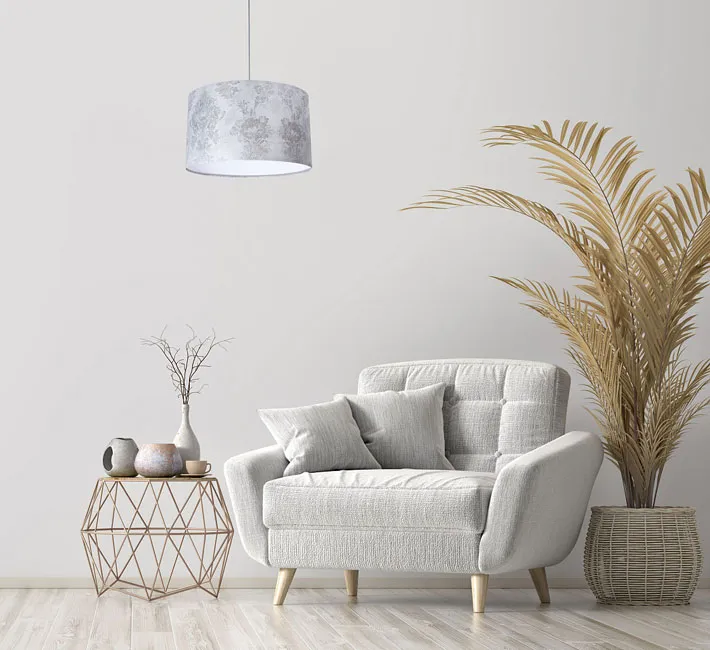 Materiał: abażur - wysokojakościowa tkanina strukturalna z nadrukiem, trwałe tworzywo PCV, podsufitka - metal