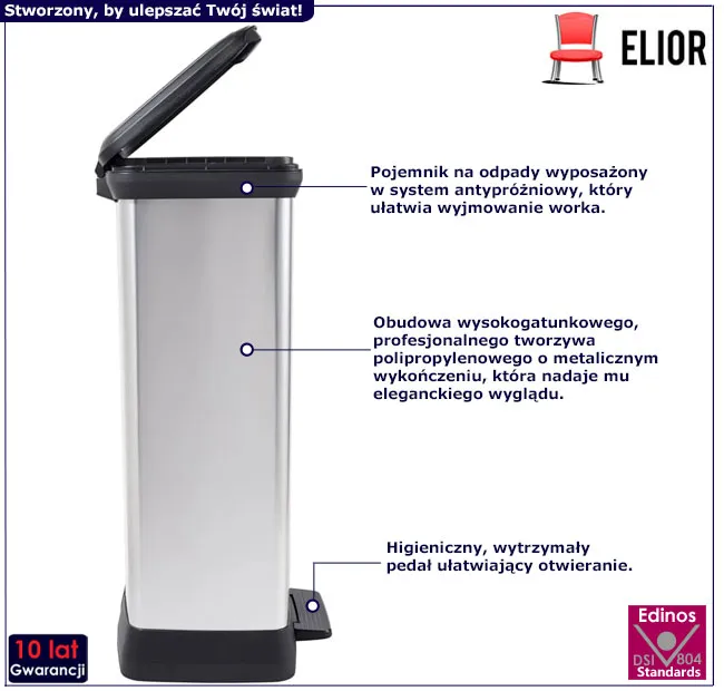 Pamiętasz pierwsze chwile spędzone w nowym domu? Wprowadzając się, zależało Ci na każdym szczególe, aby stworzyć idealną przestrzeń. Kosz na śmieci Olisso 4X marki Edinos Premium to nie tylko praktyczne rozwiązanie, ale i elegancki dodatek, który dopełni Twoje wnętrze. Jego klasyczny design, w połączeniu z nowoczesnymi funkcjonalnościami, sprawia, że codzienne obowiązki stają się przyjemniejsze, a dom bardziej harmonijny. Bez trudu otworzysz go dzięki wygodnemu pedałowi, zachowując pełną higienę. Pojemność 50 litrów z wyjmowanym pojemnikiem gwarantuje, że zawsze pozostaniesz na bieżąco z porządkami. To detal, który sprawi, że Twoje wnętrze nabierze nowego, bardziej zorganizowanego charakteru.