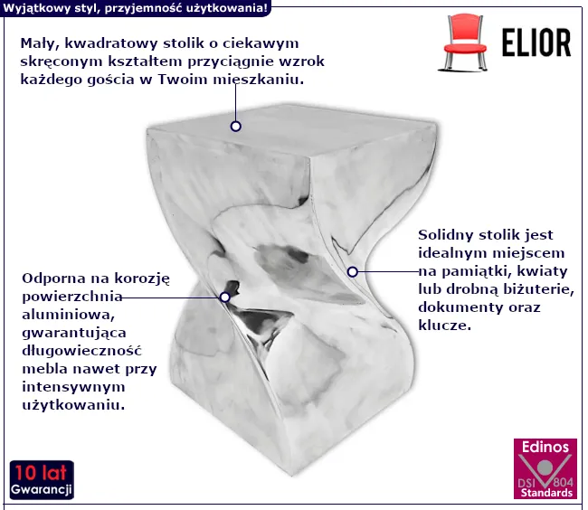 Stolik, który przyciąga uwagę niebanalnym, skręconym kształtem, idealnie wpisującym się w nowoczesne wnętrza to Umori marki Edinos Premium. Jego elegancka, srebrna powierzchnia dodaje wnętrzom świeżości i blasku, stanowiąc jednocześnie funkcjonalny element dekoracyjny. Niezależnie od tego, czy używasz go jako stolika bocznego, stojaka na rośliny, lampę czy telefon, Umori zachwyci swoją wszechstronnością i oryginalnym designem. Doskonale sprawdzi się w nowoczesnym salonie, gdzie może pełnić zarówno rolę praktyczną, jak i estetyczną. To mebel, który nie tylko ozdobi przestrzeń, ale również ją ułatwi, zapewniając miejsce na najpotrzebniejsze przedmioty. Jego kompaktowa forma sprawia, że doskonale pasuje nawet do mniejszych pomieszczeń.