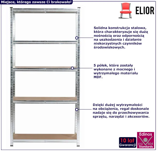 • Wysokiej jakości metal odporny na zarysowania, zadrapania oraz korozję, co przekłada się na długą żywotność i estetyczny wygląd regału.