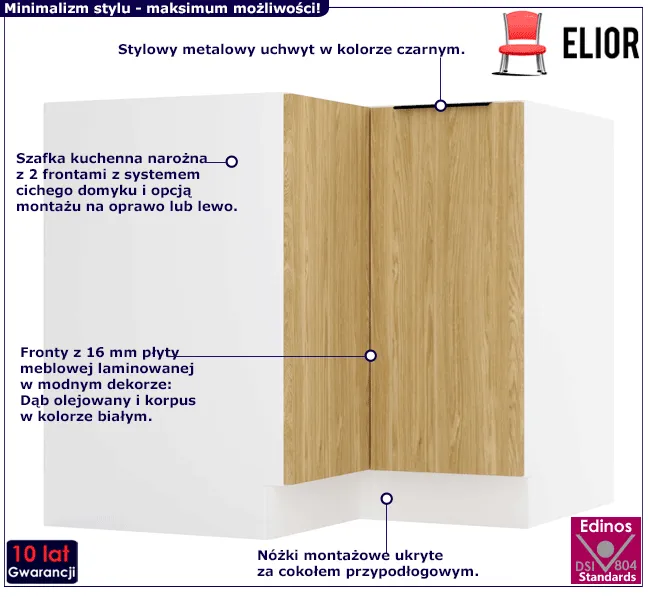 - Produkt posiada certyfikat jakości "Edinos Standards DSI 804", który potwierdza najwyższą jakość wykonania mebla oraz pełny stopień zgodności poszczególnych jednostek wytworzonego wyrobu z przyjętym wzorcem.