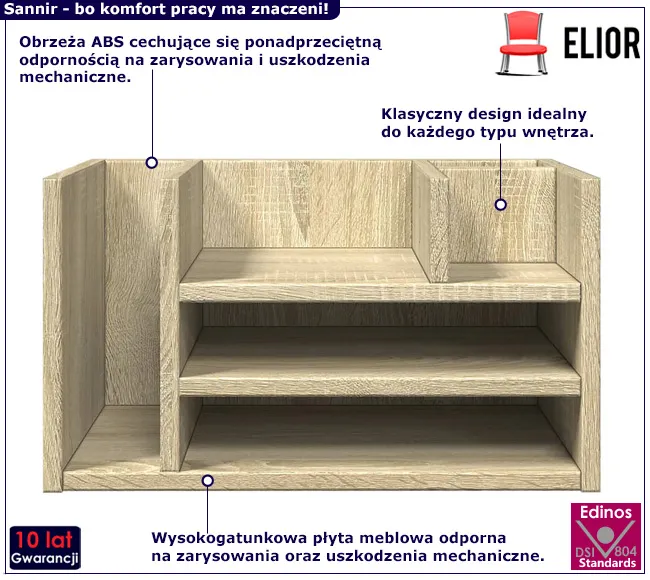 Czasem najprostsze rozwiązania okazują się najbardziej genialne. Nadstawka Yuna marki Edinos Premium, zaprojektowana w klasycznym i minimalistycznym stylu, przekształci Twoje biurko w zorganizowane i harmonijne miejsce pracy. Ten niepozorny, ale niezwykle skuteczny pomocnik codziennie sprawia, że każdy długopis, dokument czy karteczka samoprzylepna znajdą swoje stałe miejsce. Dzięki sześciu przegródkom wszystko, czego potrzebujesz, jest na wyciągnięcie ręki, a przestrzeń Twojego biurka może odzyskać swoje piękno i funkcjonalność. Oszczędzaj miejsce i ciesz się porządkiem, który mówi o elegancji, a jednocześnie zachowuje surową prostotę formy. Yuna to subtelność w parze z praktycznością, gotowa, by zagościć w każdym wnętrzu.