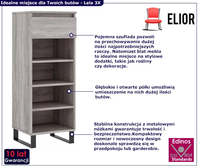 Szafka na buty Martisa 3X marki Edinos Premium to synonim nowoczesności i praktyczności, który wzbogaci każde wnętrze. Solidna konstrukcja i stylowy design to gwarancja długotrwałego użytkowania. Zdecyduj się już dzisiaj na zakup w rewelacyjnej cenie 338 zł.
