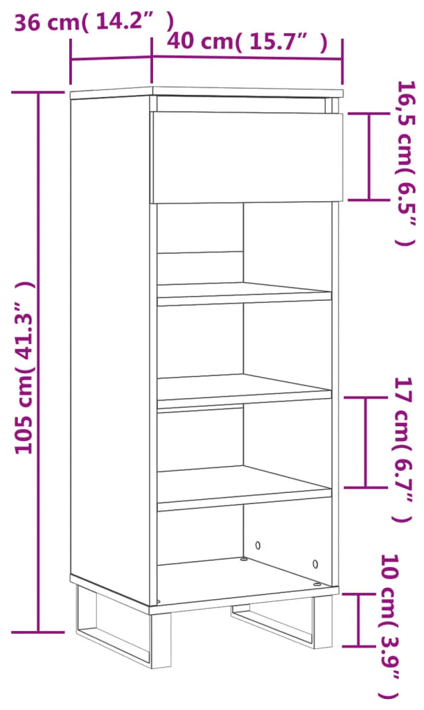 • Wymiary szafki na buty: wysokość 105 cm; szerokość 40 cm; głębokość 36 cm