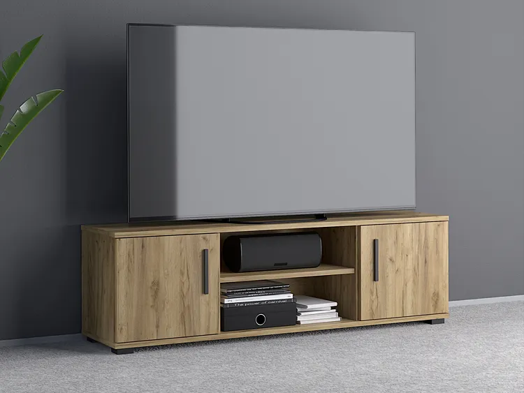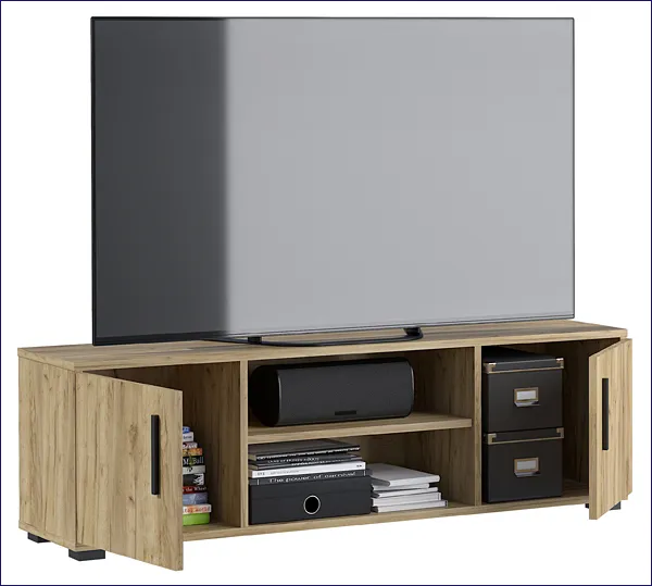 - Pojemny blat na TV lub dekoracje, 2 zamykane szafki i półki na dekoder lub konsolę.