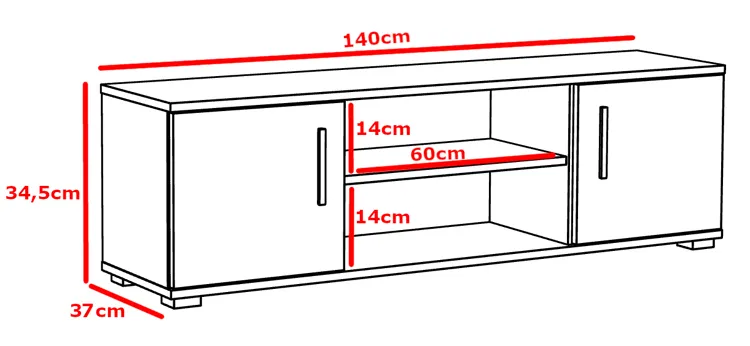 - Wymiary: wysokość: 34,5 cm, szerokość: 140 cm, głębokość: 37 cm.