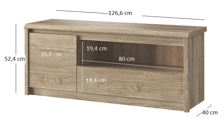 • Wymiary: szerokość: 126,6 cm, wysokość: 52,4 cm, głębokość: 40 cm.