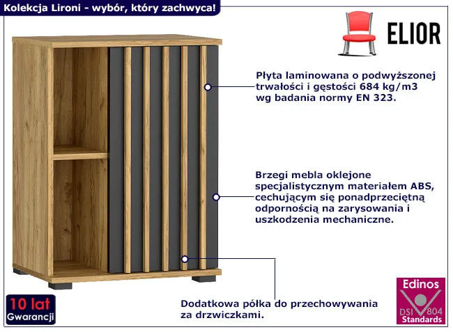 • Produkt posiada certyfikat jakości "Edinos Standards DSI 804", który potwierdza najwyższą jakość wykonania mebla oraz pełny stopień zgodności poszczególnych jednostek wytworzonego wyrobu z przyjętym wzorcem.