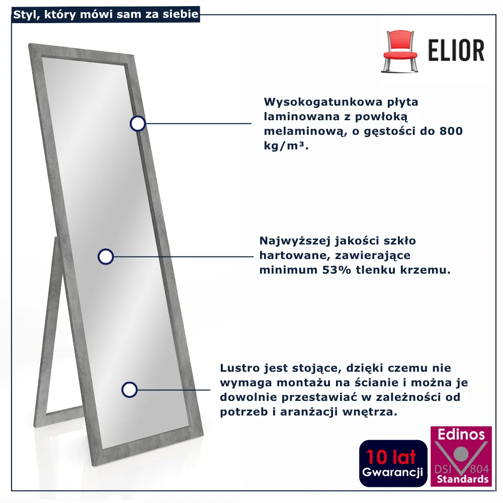 • Lustro jest stojące, dzięki czemu nie wymaga montażu na ścianie i można je dowolnie przestawiać w zależności od potrzeb i aranżacji wnętrza.