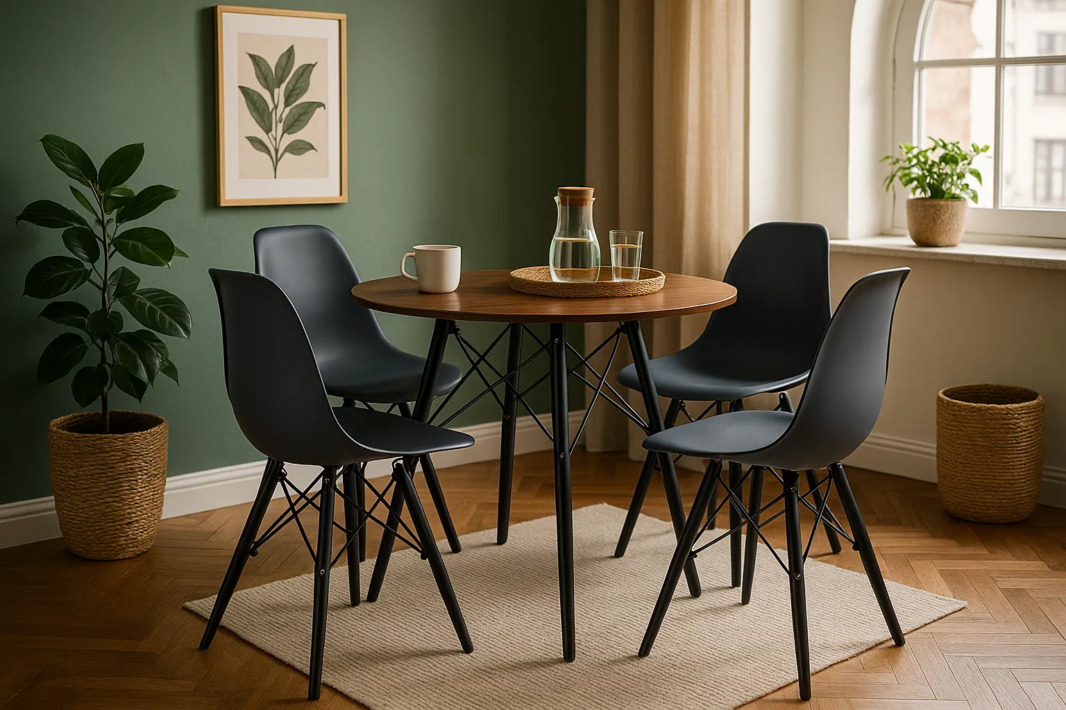 • Bukowe Drewno: Nogi stołu i krzeseł wykonane są z bukowego drewna, które jest nie tylko trwałe, ale też piękne, dzięki czemu tworzy przytulną atmosferę.
