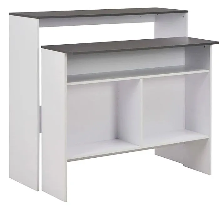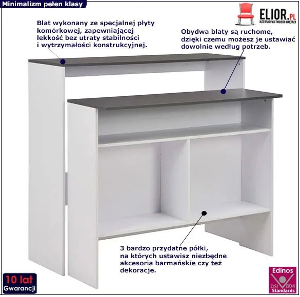 Stoły barowe w modelu Alexander składają się z 2 ruchomych blatów, które można ustawić w różnych konfiguracjach wedle potrzeby, co możesz zobaczyć na załączonych zdjęciach. Zewnętrzny, większy blat ma wymiary: 130 cm x 40 cm x 120 cm (wysokość). Pod nim ukryty jest mniejszy, o wysokości 100 cm i długości 124 cm. Możesz zostawić jeden pod drugim, by mieć dostęp do głównego blatu z 3 półkami tuż pod ręką lub też rozstawić je bardziej przestrzennie, np. prostopadle i stworzyć swój kącik barowy. Dzięki tej elastyczności, nasz stół Alexander nadaje się do wielu pomieszczeń i pozwala na pomysłowe obejście ograniczeń metrażowych. Model Nexa 3X jest w większości biały, ale przełamany szarością blatu, co wywołuje wrażenie schludności, lekkości i pasuje do wielu wystrojów: minimalistycznego, romantycznego, nowoczesnego. Możesz zaaranżować jego otoczenie oraz udekorować go przedmiotami tak, by lokal nabrał niepowtarzalnego, wyrazistego stylu, który zachwyci gości czy to w przestrzeni prywatnej czy biznesowej.