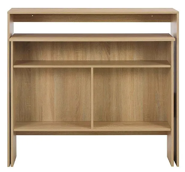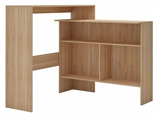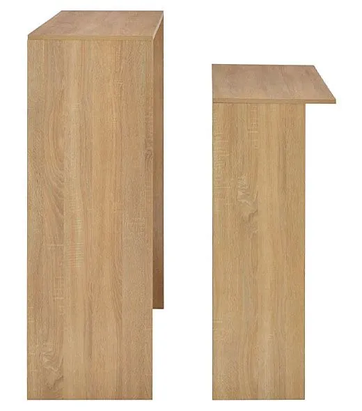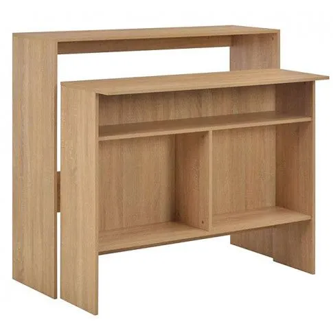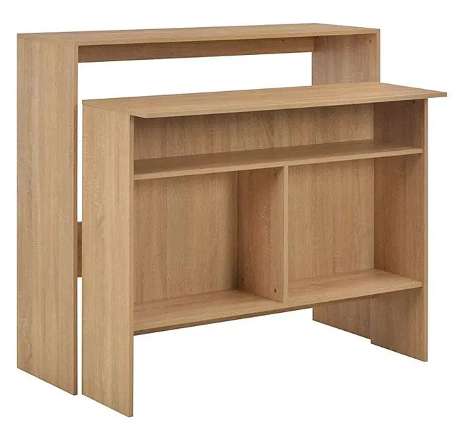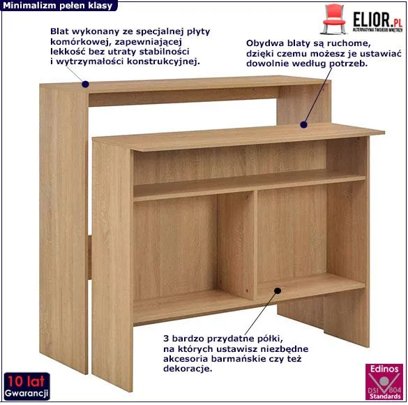 Stoły barowe w modelu Alexander składają się z 2 ruchomych blatów, które można ustawić w różnych konfiguracjach wedle potrzeby, co możesz zobaczyć na załączonych zdjęciach. Zewnętrzny, większy blat ma wymiary: 130 cm x 40 cm x 120 cm (wysokość). Pod nim ukryty jest mniejszy, o wysokości 100 cm i długości 124 cm. Możesz zostawić jeden pod drugim, by mieć dostęp do głównego blatu z 3 półkami tuż pod ręką lub też rozstawić je bardziej przestrzennie, np. prostopadle i stworzyć swój kącik barowy. Dzięki tej elastyczności, nasz stół Alexander nadaje się do wielu pomieszczeń i pozwala na pomysłowe obejście ograniczeń metrażowych. Model Nexa 5X jest w kolorze pięknego jasnego dębu, dzieki czemu dodaje elegancji wnetrzu oraz czyni je cieplejszym i przyjemnym. Stół ten pasuje do wielu wystrojów: minimalistycznego, romantycznego, nowoczesnego czy skandynawskiego. Możesz zaaranżować jego otoczenie oraz udekorować go przedmiotami tak, by lokal nabrał niepowtarzalnego, wyrazistego stylu, który zachwyci gości czy to w przestrzeni prywatnej czy biznesowej.