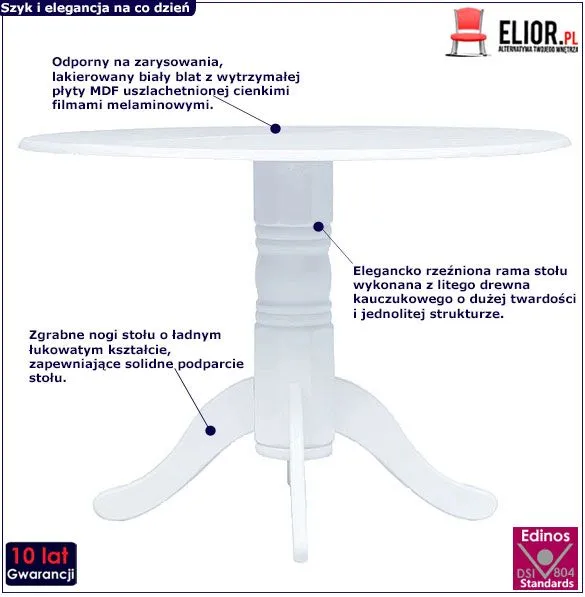 • Symetryczny, regularny kształt i solidny wygląd - esencja elegancji i klasyki desingu dla osób poszukujących jakości - zobacz tez inne stoły okrągłe w białym kolorze w sklepie Edinos.pl - na pewno znajdziesz coś dla siebie!