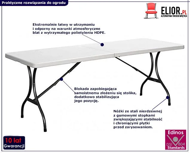 Oprócz tego jego mocna konstrukcja ze stali z blokadą uniemożliwia samoistne złożenie się, gwarantując jednocześnie błyskawiczne i bezproblemowe rozkładanie i składanie stołu.