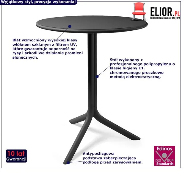 Designerski stół Dess wyróżnia profesjonalne wykonanie z wysokiej jakości, szlachetnego surowca. Jest to profesjonalny polipropylen o klasie higieny E1, który został chromowany proszkowo metodą elektrostatyczną. Dzięki niemu stół zawdzięcza wyjątkową trwałość, a także odporność na zarysowania oraz uszkodzenia mechaniczne. Ponadto polipropylen został wzmocniony wysokogatunkowym włóknem szklanym, które posiada filtr UV. Chroni to stół przed negatywnym wpływem promieni słonecznych. Każdy z nas lubi starannie zaprojektowane, szlachetne meble. Dzięki wyselekcjonowanym surowcom oraz profesjonalnej obróbce stół Dess nie tylko cieszy oko ponadczasową klasą, lecz przede wszystkim zapewnia komfort i wygodę wynikającą z jego porządnego, trwałego wykonania. Dobór komfortowego w użytkowaniu, starannie wykonanego a do tego wszystkiego jeszcze stylowo prezentującego się stołu nie zawsze bywa prostym zadaniem. Na szczęście są kolekcje, w których znajdują się same nowoczesne, profesjonalnie zaaranżowane meble. I to właśnie czarny stół Dess pochodzi z takiej kolekcji! Zapewniamy Ci szyk, który nie wychodzi z mody i trwałość, która służy na lata. Mistrzowsko zaprojektowany stół Dess wnosi do wnętrz samą radość - z użytkowania, z patrzenia, z aranżowania i z niestarzejącego się, zawsze modnego designu.