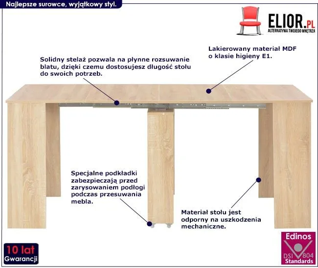 Epioz utrzymany w jasnobrązowym kolorze dąb sonoma i wykonany z płyty MDF i stalowych prowadnic na pewno wniesie do Twoich wnętrz nieco rustykalnego uroku. Podstawą stołu są twarde nogi, które projektanci marki Edinos Premium zabezpieczyli podkładkami, dzięki czemu mebel nie zarysuje podłogi. Po rozłożeniu stołu dodatkowej stabilności dodadzą mu natomiast dwie nóżki, które służą do podparcia środkowej części mebla.