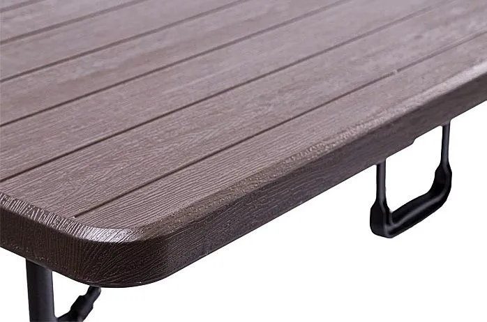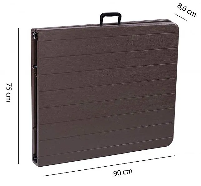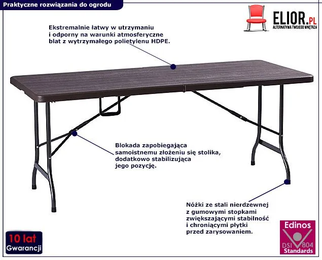 Stół rozkładany Noaria marki Elior w kolorze chłodnego brązu ma odpowiednio dużą powierzchnię, byś zmieścił/a na nim wszystkie pyszne potrawy oraz wszystko inne czego potrzebujesz – będzie niezbędnym towarzyszem podczas grilla czy innej imprezy. To stół ogrodowy lub cateringowy, przy którym w końcu zmieścisz całą swoją rodzinę albo innych gości. Noaria nie zajmie i tak deficytowego miejsca podczas przechowywania, dzięki możliwości błyskawicznego złożenia go w poręczną, płaską walizeczkę, którą zmieścisz dyskretnie gdzieś na uboczu, a w razie potrzeby równie szybko rozłożysz. Możesz go też spakować do bagażnika i zabrać w plener lub do znajomych. Nasz stół wykazuje się wspaniałą odpornością na niekorzystne warunki nieodrodnie związane z eksploatacją na zewnątrz: jest wodoodporny, nie musisz się o niego martwić tak jak o drewniane meble. Dobrze znosi wysoką temperaturę, nie odbarwia się i posłuży Ci długo w przeciwieństwie do brzydkich jednosezonówek z taniego plastiku. Bardzo łatwo odczyścisz wszelkie plamy i inne zabrudzenia, wystarczy go przetrzeć mokrą szmatką, żadnego szorowania! Stół rozkładany Noaria łączy w sobie funkcjonalność tworzywa z wysokiej jakości, gęstego polietylenu HDPE z estetycznym wyglądem: fakturą imituje drewniane deseczki w kolorze ciemnego, chłodnego brązu – zdecydowanie nie będzie wyglądał „tanio”. Nie wywróci się przy najmniejszym podmuchu wiatru czy potrącony przez dokazujące dzieci – ma bowiem blokadę zabezpieczającą przed samoistnym złożeniem. Ponadto, jego nóżki są ulepszone gumową, antypoślizgową powłoką, co powoduje, że stół nie będzie ślizgał się na mokrej trawie lub po prostu niestabilnym podłożu, ale też nie zarysuje płytek, jeśli będziesz z niego korzystać na tarasie czy werandzie.