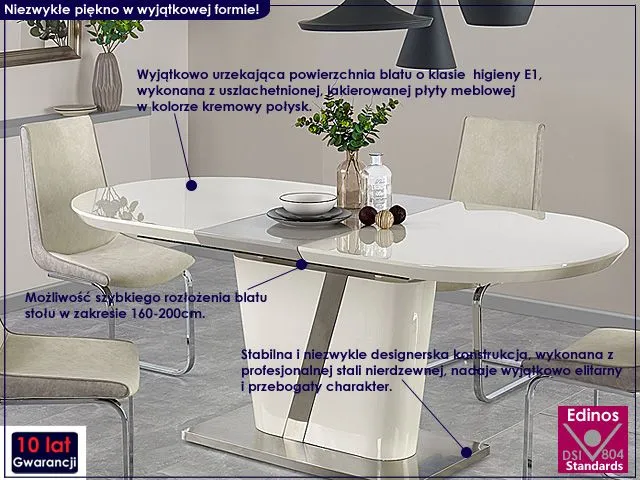 Stół to centralny mebel Twojego wnętrza. Mogą dziać się przy nim rzeczy piękne, czarodziejskie i fascynujące. Niestety Twój stół usłyszy kiedyś także inne reakcje emocjonalne jak chociażby gniew, przygnębienie czy rozdrażnienie. Zadbaj więc o to, aby ten najważniejszy mebel Twojego domu godnie znosił wszystkie panujące u Ciebie myśli, nastroje i emocje. Postaw na profesjonalny produkt znanego producenta, który jako jedyny na rynku oferuje Ci aż 10 lat gwarancji i niebywale ekscytujący design. Zakochasz się w nim od pierwszego wejrzenia.