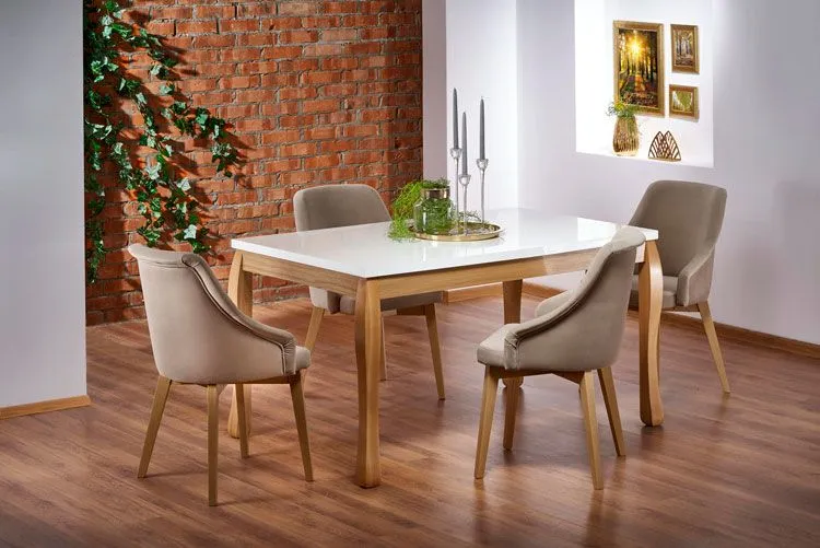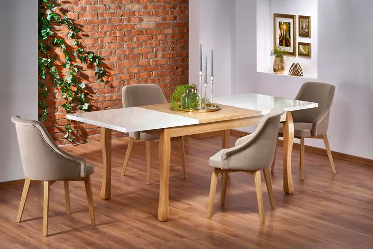 Stół to wyjątkowy mebel. To nieoceniony świadek naszych radości, smutków, naszych sukcesów i porażek. To przy jego blacie spożywamy posiłki, pracujemy, rozmawiamy, relaksujemy się. Stół to serce każdej kuchni, jadalni, salonu. Zdolni projektanci marki Elior stworzyli zacny model stołu, który z powodzeniem odnajdzie się w Twoim wnętrzu. Novis, bo o nim mowa, to solidny mebel, wykonany z wysokiej klasy materiałów. Jego blat to uszlachetniona laminatem wysokogatunkowa płyta MDF o gęstości powyżej 759,8 kg/m³ i klasie higieny E1. Blat jest odporny na zarysowania, wilgoć i inne uszkodzenia mechaniczne. Komfortowy, prostokątny blat to przykład ponadczasowego połączenie wygody i eleganckiego designu. Stoły prostokątne pasują zarówno do mniejszych, jak i większych pomieszczeń. Świetnie prezentują się w centralnej części pokoju, a także ustawione pod ścianą. Kontynuując informacje techniczne, warto wyróżnić nogi stołu, które zachwycają zarówno ciekawą formą, jak i trwałością surowca, z którego zostały wykonane. Stylowe nogi stołu Novis to wysokogatunkowe lite drewno bukowe. Naturalne drewno to bez wątpienia jeden z najtrwalszych i najbardziej eleganckich surowców służących do produkcji mebli. Buk to klasa sama w sobie. Jest piękny, unikatowy i w 100% ekologiczny. Przepięknie prezentuje się w przestrzeni kuchni, jadalni czy salonu. Stół Novis to świetna propozycja do wnętrz urządzonych w stylu skandynawskim, nowoczesnym, a nawet klasycznym. Połączenie śnieżnobiałego blatu z z pozostałymi elementami korpusu o szlachetnym odcieniu naturalnego dębu to inwestycja w przytulne, pełne harmonii wnętrze. Rozkładany stół Novis to niepowtarzalne dzieło naszych stolarzy, wykonany z niezwykłą troską o każdy, nawet najmniejszy detal. Zakochasz się w nim.