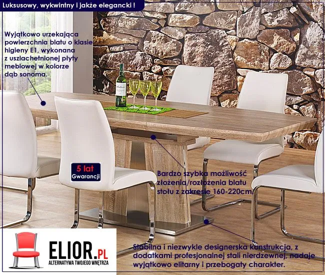 Stół to centralny mebel Twojego wnętrza. Mogą dziać się przy nim rzeczy piękne, czarodziejskie i fascynujące. Niestety Twój stół usłyszy kiedyś także inne reakcje emocjonalne jak chociażby gniew, przygnębienie czy rozdrażnienie. Zadbaj więc o to, aby ten najważniejszy mebel Twojego domu, godnie znosił wszystkie panujące u Ciebie myśli, nastroje i emocje. Postaw na profesjonalny produkt znanego producenta, który jako jedyny na rynku oferuję Ci aż 5 lat gwarancji i niebywale ekscytujący design. Zakochasz się w nim od pierwszego wejrzenia.