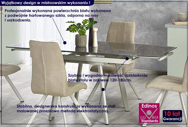 Stół to centralny mebel Twojego wnętrza. Mogą dziać się przy nim rzeczy piękne, czarodziejskie i fascynujące. Niestety Twój stół usłyszy kiedyś także inne reakcje emocjonalne jak chociażby gniew, przygnębienie czy rozdrażnienie. Zadbaj więc o to, aby ten najważniejszy mebel Twojego domu, godnie znosił wszystkie panujące u Ciebie myśli, nastroje i emocje. Postaw na profesjonalny produkt znanego producenta, który jako jedyny na rynku oferuje Ci aż 10 lat gwarancji i niebywale ekscytujący design. Zakochasz się w nim od pierwszego wejrzenia.