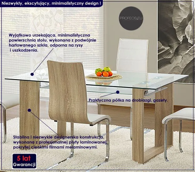 Stół to centralny mebel Twojego wnętrza. Mogą dziać się przy nim rzeczy piękne, czarodziejskie i fascynujące. Niestety Twój stół usłyszy kiedyś także inne reakcje emocjonalne jak chociażby gniew, przygnębienie czy rozdrażnienie. Zadbaj więc o to, aby ten najważniejszy mebel Twojego domu, godnie znosił wszystkie panujące u Ciebie myśli, nastroje i emocję. Postaw na profesjonalny produkt znanego producenta, który jako jedyny na rynku oferuję Ci aż 5 lat gwarancji i niebywale ekscytujący design. Zakochasz się w nim od pierwszego wejrzenia.