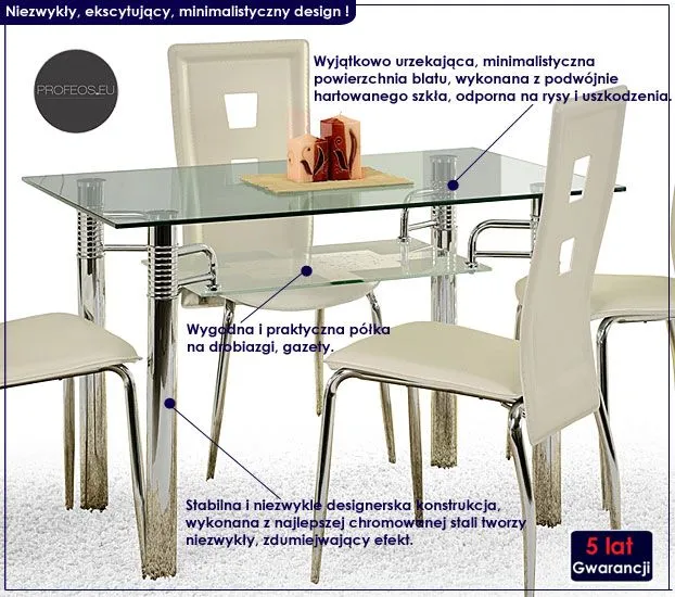 Stół to centralny mebel Twojego wnętrza. Mogą dziać się przy nim rzeczy piękne, czarodziejskie i fascynujące. Niestety Twój stół usłyszy kiedyś także inne reakcje emocjonalne jak chociażby gniew, przygnębienie czy rozdrażnienie. Zadbaj więc o to, aby ten najważniejszy mebel Twojego domu, godnie znosił wszystkie panujące u Ciebie myśli, nastroje i emocje. Postaw na profesjonalny produkt znanego producenta, który jako jedyny na rynku oferuję Ci aż 5 lat gwarancji i niebywale ekscytujący design. Zakochasz się w nim od pierwszego wejrzenia.