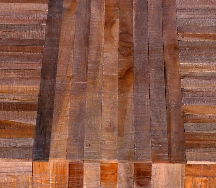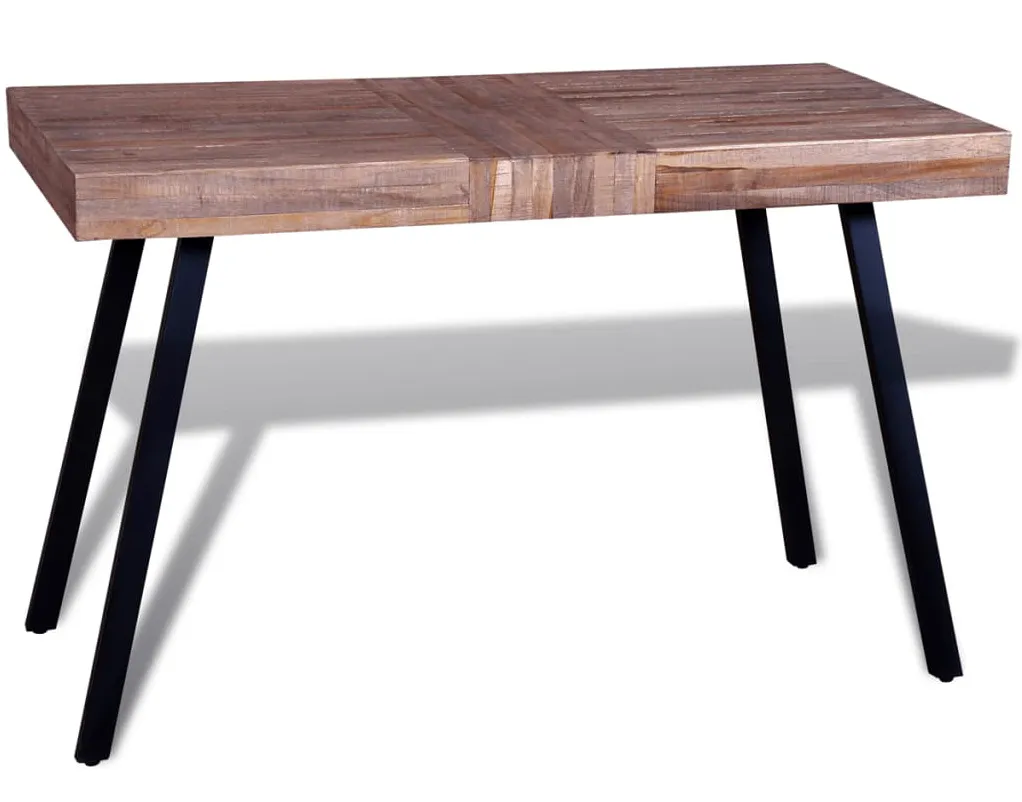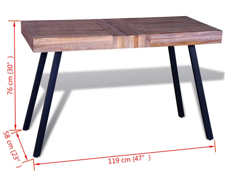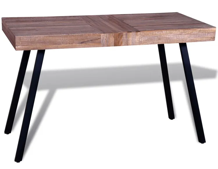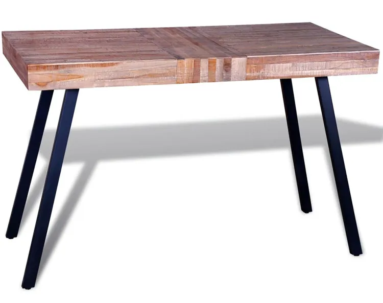 Mega gruby blat z drewna tekowego, robi fajne wrażenie. Ten design wykonany z małych deseczek jest prze mocarny i oryginalny, wygląda bardzo dobrze. Żelazne odpowiednio rozstawione nogi to stabilność nie lada. Generalnie nie mam nic za złe sklepowi bo w 100%. Uniwersalizm stołu aż bije od niego, Praktycznie i tanio.