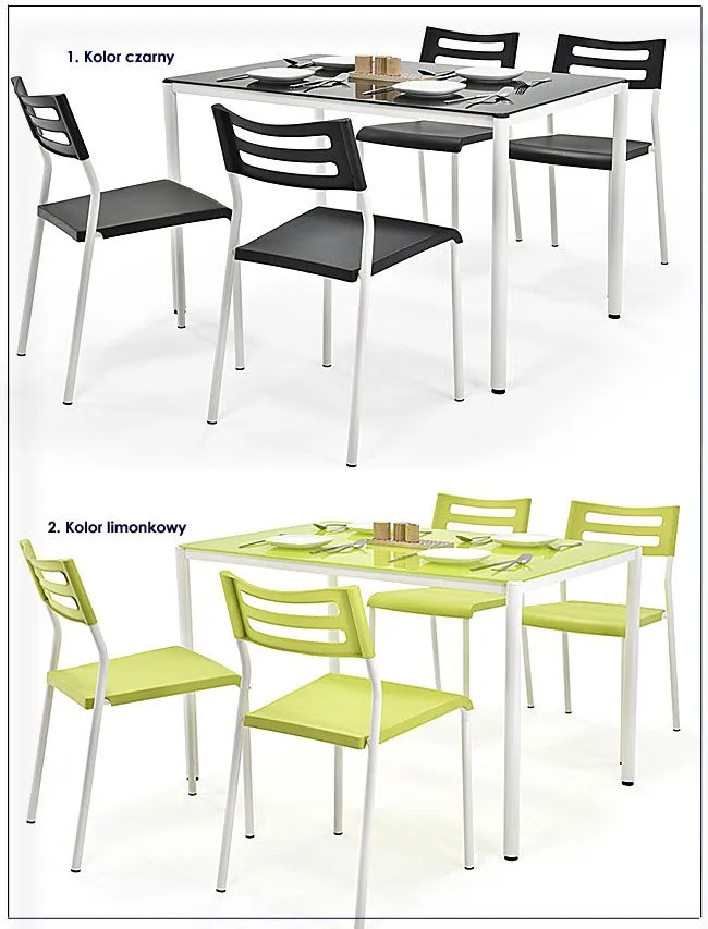 Komfortowy zestaw Elewzi wyróżnia się nie tylko swoją unikalną formą ale także zastosowaniem materiałów najlepszej jakości. To dlatego cieszy się on powodzeniem wśród osób lubiących ciekawe rozwiązania. Blat stołu oraz krzesła pokryte zostały wysokiej jakości tworzywem polimerowym odpornym na zarysowania i łatwym w utrzymaniu czystości. Ekspresywne kolory (wyrazisty czarny lub limonkowy) dodadzą nieco barwy oraz ostrości wnętrzu Twojej kuchni lub jadalni. Nowy zestaw Elewzi jest z pewnością praktyczny i elegancki.