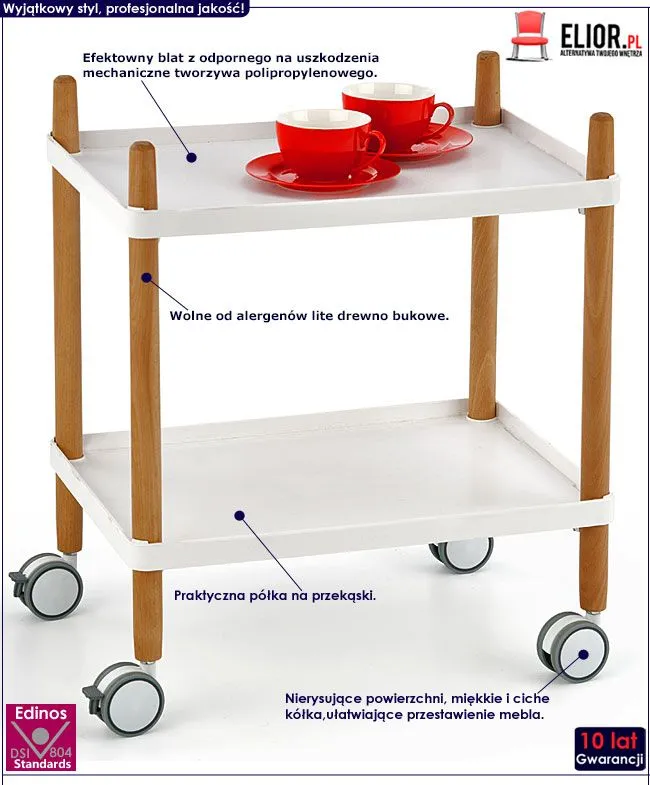 - Kolor: Blaty białe, konstrukcja stolika w kolorze buk. Kliknij w link i sprawdź także inne stoliki na kółkach w sklepie Edinos.pl. Stwórz swój praktyczny zestaw mebli.