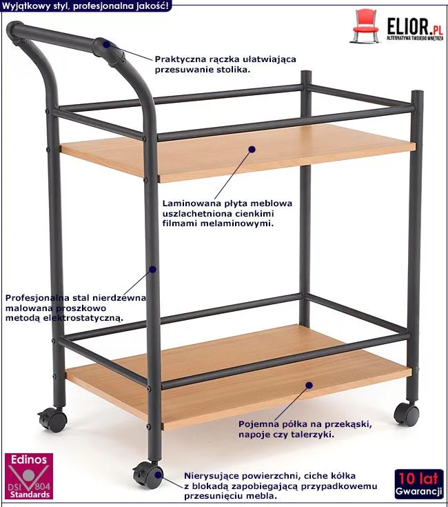 Barek na kółkach Fakir to nie tylko wysoka funkcjonalność i atrakcyjny design. Projektanci marki Elior zadbali również o wykorzystanie starannie wyselekcjonowanych materiałów. Oba blaty mebla wyprodukowano z najwyższej jakości laminowanej płyty MDF o klasie higieny E1 w kolorze naturalnego drewna, uszlachetnionej cienkimi filmami melaminowymi. Posiada także specjalne włókna ułożone różnokierunkowo o strukturze sinusoidalnej, co zapewnia nadanie jej cech jakościowych oraz wytrzymałościowych. Czarną konstrukcję stolika stworzono z najwyższej jakości nierdzewnej stali malowanej odpornym na zarysowania i zadrapania. Najwyższa jakość techniki polimeryzacji pozwoliła zaoferować firmie Elior aż 10 lat gwar. na swoje produkty. Już nie musisz się martwić, że po kilku latach część farby odpryśnie od mebla . Użycie tych wysokojakościowych materiałów znacząco wydłuża czas eksploracji mebla. Stolik barowy Fakir przetrwa więc w nienaruszonym stanie niejedną imprezę do białego rana!