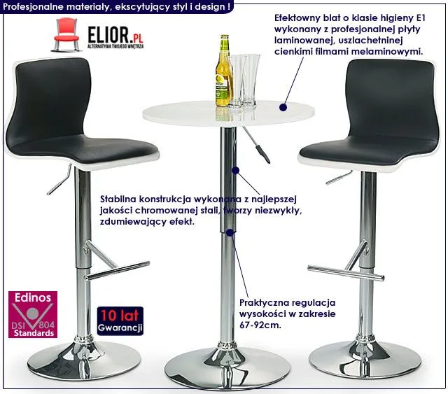 Prezentujemy Ci jakże efektowny wizualnie i bardzo praktyczny w użytkowaniu stolik barowy Travol White marki Elior. Mebel wykonany został z naturalnej płyty meblowej w kolorze białym oraz wysokiej jakości nierdzewnej stali chromowanej. Energia płynąca z niezwykłej formy stołu Travol, rozpali w Tobie nowe pokłady inspiracji a Twoje wnętrze nabierze nowego, wyjątkowego designu. Łyk każdej kawy wypitej przy stole marki Elior doda Ci harmonii oraz pozwoli odetchnąć od codziennego chaosu i pośpiechu.
